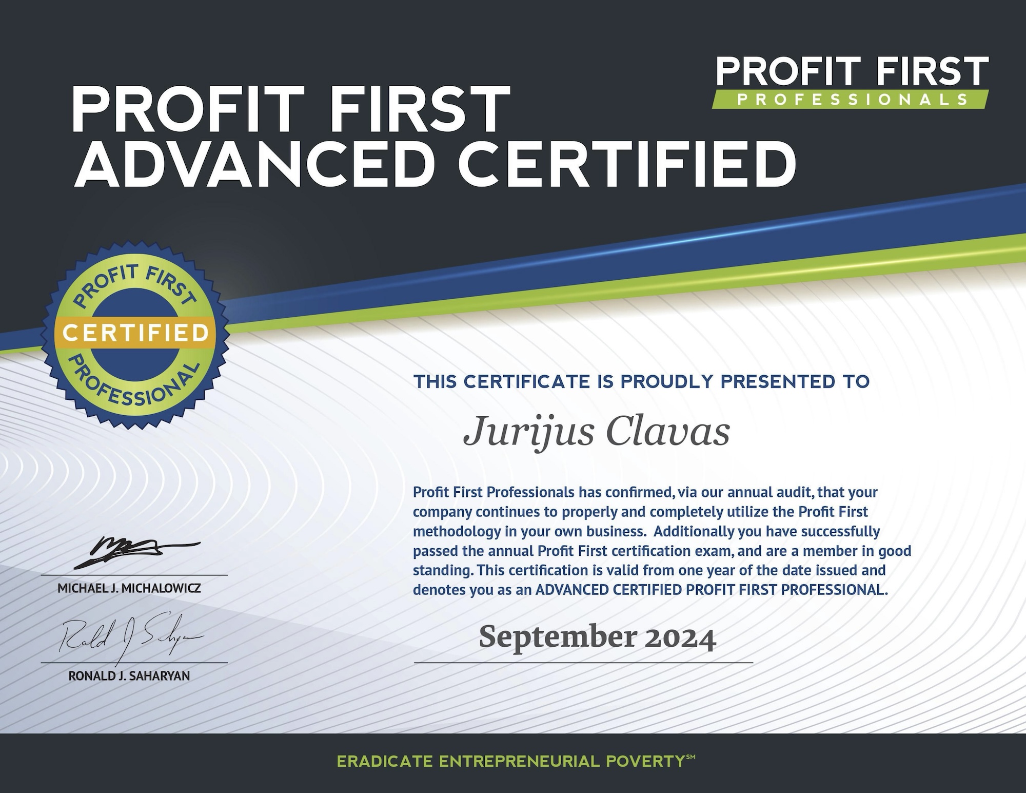 Mes esame pirmieji Lietuvoje ir Estijoje, gavę „Profit First Professional Advanced“ sertifikatą.